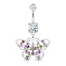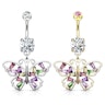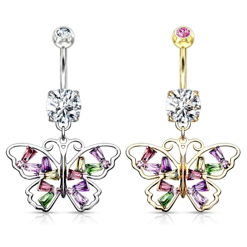 På bilden ser du en navelpiercing med en fjäril. Fjärilen har fått sina vingar dekorerade med flera små stenar i olika färger. Stenarna är både runda och kulformade och ger ett vackert utseende till resten av smycket.