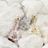 Navelpiercingen du ser på bilden ovan föreställer en påfågel. Påfågeln har med sina marquiseslipad stenar slagit ut sina stjärtfjädrar, som är en del av parningsritualen, där hanarna skrämmer varandra. Normalt har en hane mellan 100 och 150 stjärtfjädrar – här får du dock nöja dig med sju stycken, som är gjorda av sten.