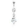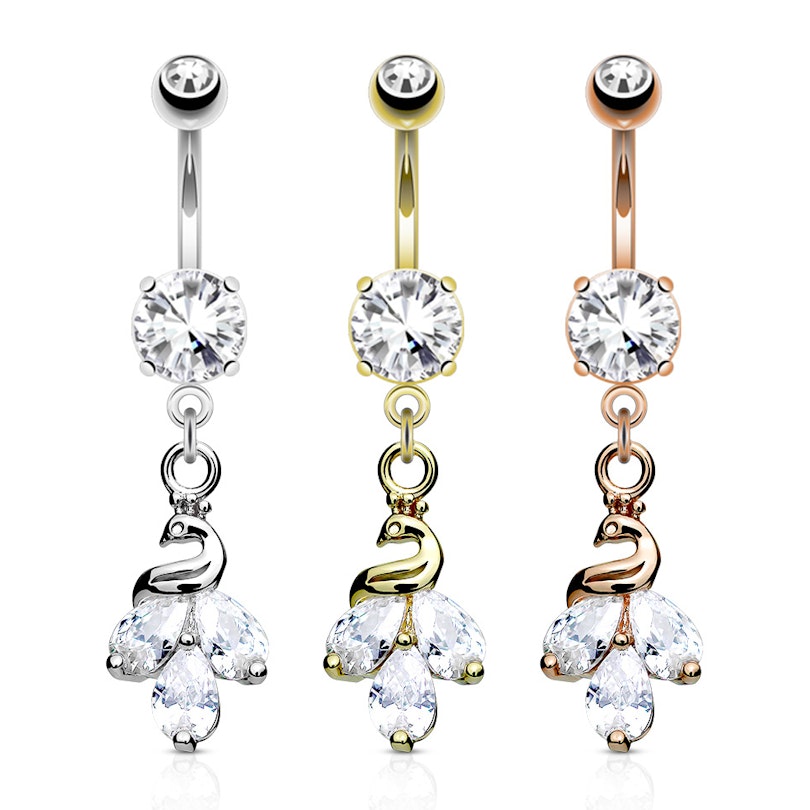 Påfågeln är ett otroligt färgrikt djur – hanarna framför allt. Påfågelhannarna använder sina praktfulla och färgrika svanfjädrar till att locka en hona. På navelpiercingen du kan se längre upp är påfågeln lite mer diskret. Påfågelns svanfjädrar är ersatte med tre droppformade klara stenar som är minst lika storslagna som äkta svanfjädrar. Med navelsmycket är du färdig att locka din partner med hjälp av påfågelns vackra ”svanfjädrar”. Smycket är belagt med 14 karat guld, vilket passar perfekt till detta vackra motiv.