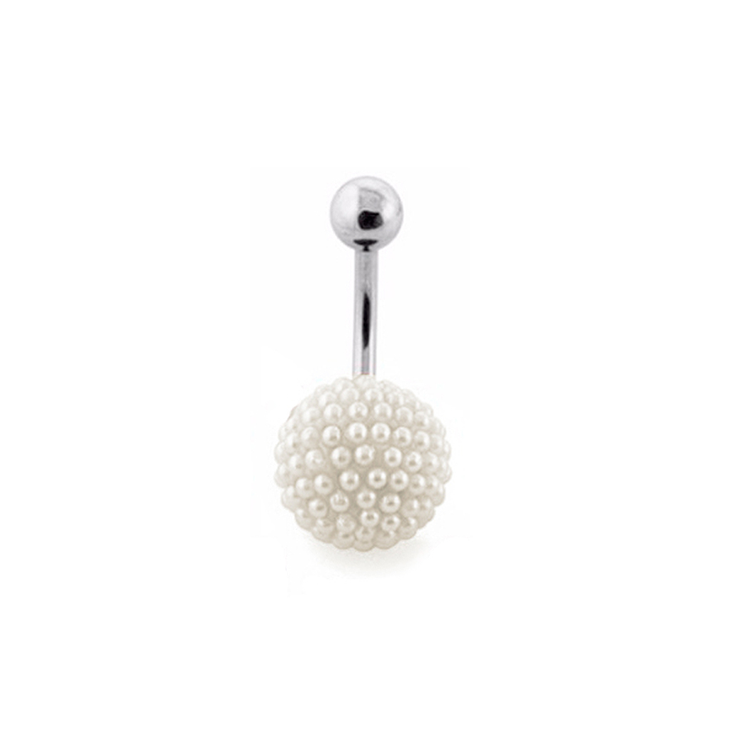 Navelpiercingar och pärlkulor är verkligen något som går riktigt bra ihop. Den här modellen är inget undantag till den regeln då den har en massa små kulor som pryder bindkulan. Smyckets stav och toppkula är båda gjorda av kirurgiskt stål medan bindkulan är gjord av färgad lermassa. Små akrylkulor har sedan tryckts ned i lermassan och hårdnat. Färgen på den hårda leran matchar naturligtvis de små akrylkulorna i färgen.