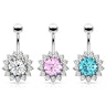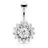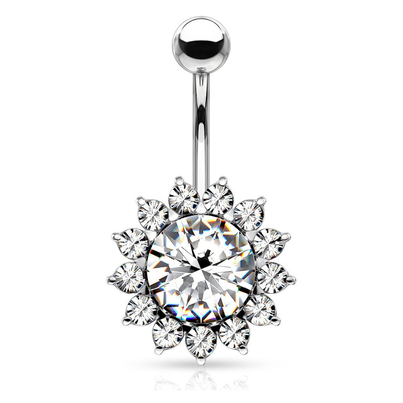 Denna navelpiercing har en stor snygg sten i mitten som fångar ljuset otroligt fint. Runt om denna stora sten är det hela vägen runt mindre stenar som formar en bladliknande design.