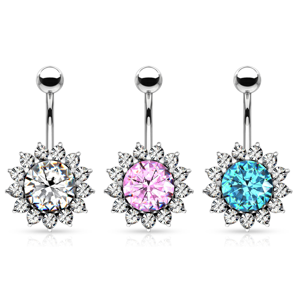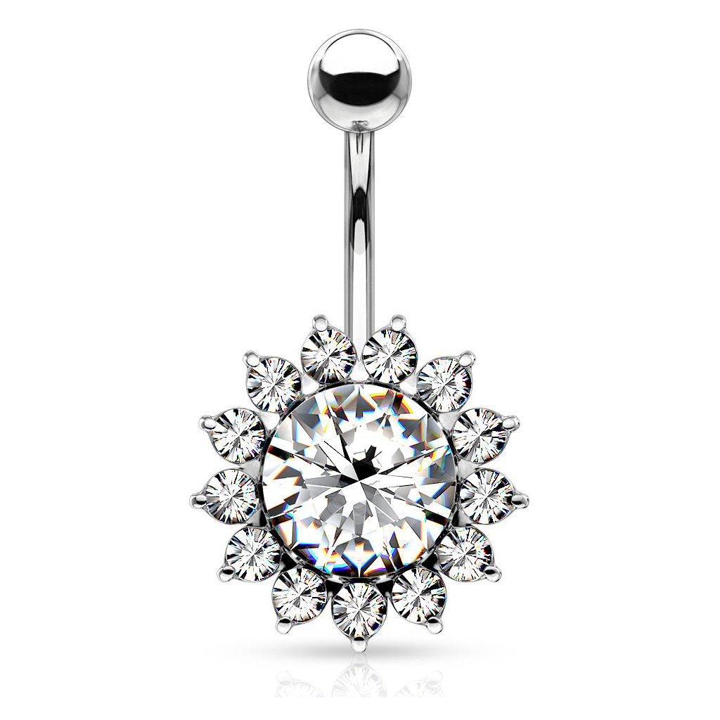 Denna navelpiercing har en stor snygg sten i mitten som fångar ljuset otroligt fint. Runt om denna stora sten är det hela vägen runt mindre stenar som formar en bladliknande design.