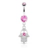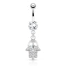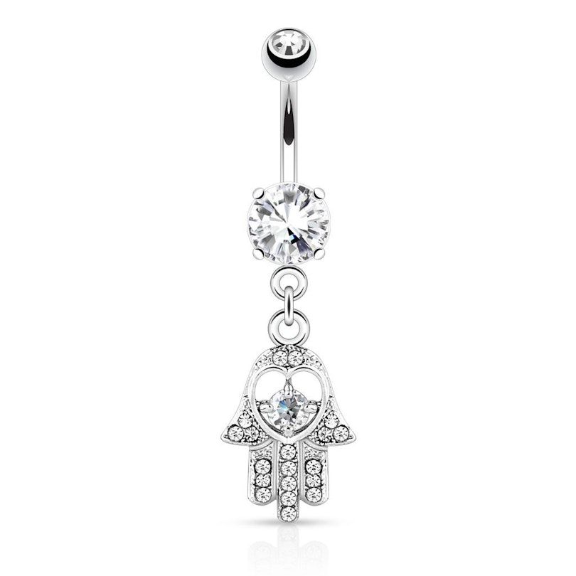 Här kan du få dig en riktigt snygg navelpiercing med hamsahand i hänget. Hamsahanden är en äldgammal symbol från Mellanösten där det blev betraktad som en skyddande amulet för den som bar det på sin keopp. Av samma anledning blev hamsahanden också snabbt ett populärt motiv till smycken.