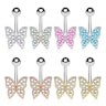 Navelpiercingen med fjäril på framsidan, som är perfekt till att visa i sommarvärmen! Denna navelpiercing är gjort av kirurgiskt stål och med en framsida av mässing. Framsidan har blivit gjord till att likna en fjäril, där på fjärilen är fylld med små, mousserande stenar. På denna navelpiercing kan du själv välja färg på fjärilen, du kan bland annat välja mellan blank och guld. Du kan också själv välja färg på de små stenarna, där du exempel kan välja mellan klar och aurora borealis.