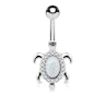Är du galen i alla havets djur, även sköldpaddor? Då har vi den perfekta navelpiercingen för dig. Denna navelpiercing är gjort av kirurgiskt stål, där det i änden sitter en frontmässing. Framsidan på detta smycke är gjort till att likna en sköldpadda. Sköldpaddan har dekorerat två små, svarta stenar på huvudet, som ska föreställa sköldpaddans ögon. På sköldpaddans sköld sitter det en stor syntetisk opal i mitten. Denna opal är inringat av en massa små klara stenar. Även om opalen är konstgjort, går det inte ut över utseendet på stenen, den är lika snyggt som om det vore en äkta opal.
