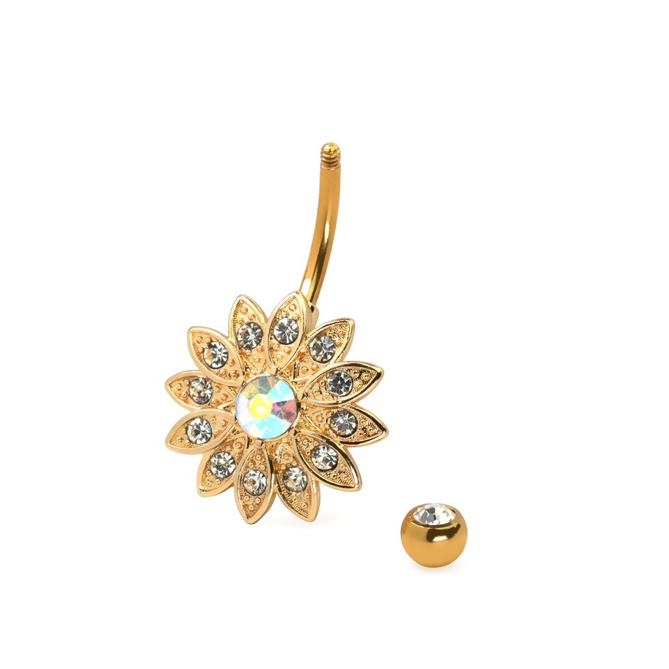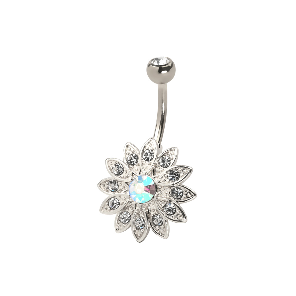 Blomman består i all blygsamhet av hela 12 avlånga blommorblad som varje en är dekorerad med en skinande vacker klar sten. Alla stenarna glittrar och gnistrar när smycket rör på sig och ljuset fångas och reflekteras i alla stenar. Det ser helt fantastisk snygg ut när navelpiercingen är används där smycket ju typiskt kommer att vara i rörelse. Alla dessa blomblad sitter tätt i två lager så blomman kommer både se fyllig och frodig ut med sin påkostade design.