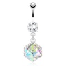 Den stora kubeformade stenar är designad så den reflekterar alla regnbågens färger när ljuset träffar den så den skapar verkligen uppmärksamhetsfångare hos den som bär smycke. Top- och bindkulan är naturligtvis också utrustad med en klar sten varje som matchar perfekt till alla små klara stenar som omsluter den stor. Allt är välgjord ned till minsta detalje i denna vackra navelpiercing så ifall du älskar unika smycken av bra kvalitet så är detta smycke definitivt ett riktigt bra val.