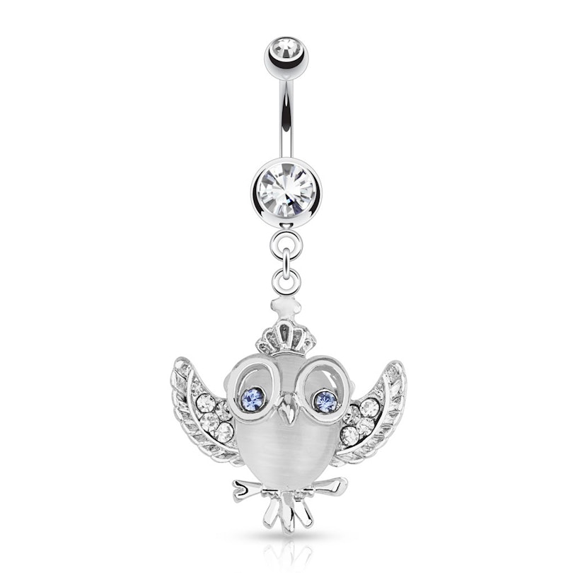 Du hittar helt enkelt inte ett sötare smycke än denna härliga navelpiercing med den sötaste lilla ugglan i hänget. Den översta delen av smycket är gjord av kirurgiskt stål och består av en 10 mm. stav där både topp- och bindkulorna är utrustade med en snygg sten i den av de två färger som du själv väljer.