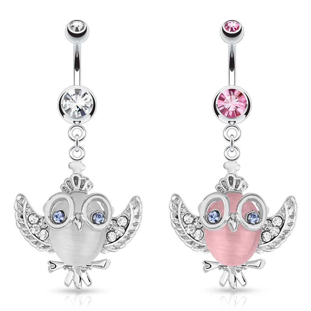 Du hittar helt enkelt inte ett sötare smycke än denna härliga navelpiercing med den sötaste lilla ugglan i hänget. Den översta delen av smycket är gjord av kirurgiskt stål och består av en 10 mm. stav där både topp- och bindkulorna är utrustade med en snygg sten i den av de två färger som du själv väljer.