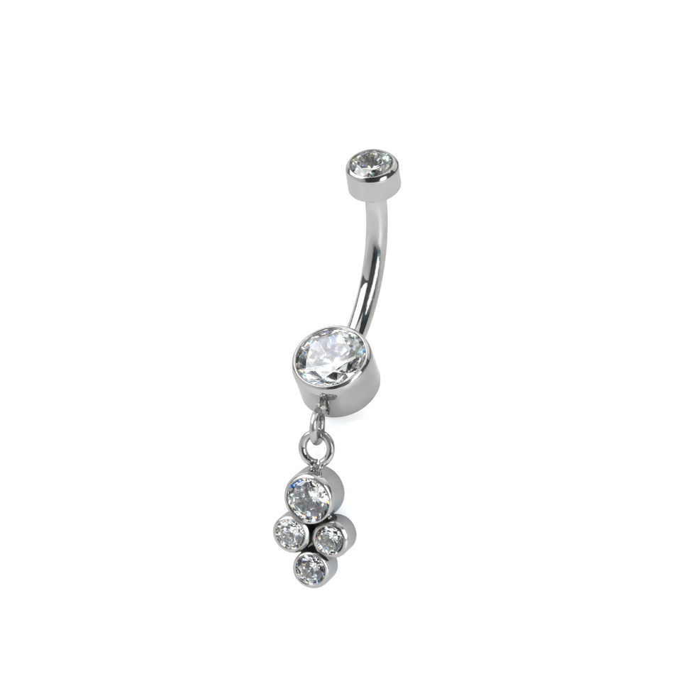 Det här navelsmycket utstrålar extravagans med sina fyra stenar i bezelfattning som hänger från en större glittrande sten, och har ännu en sten på den invändigt trådade toppen.
