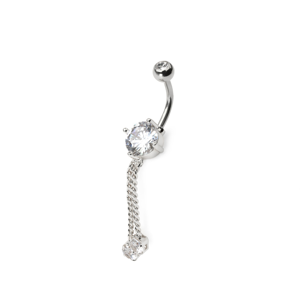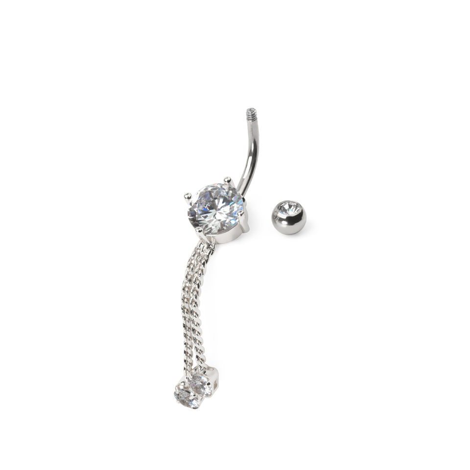 Den här vackra ringen visar verkligen vad du går för. Den dinglande kedjan har små stenar för elegans och rörelse, vilket gör den här ringen extra unik. Den är tillverkad i kirurgiskt stål vilket gör den bekväm och hållbar. Staven är 10 mm lång med en trådtjocklek på 1,6 mm. Kedjan hänger ned 28 mm från stenen. Den finns tillgänglig i guld, silver, eller rosaguld med klara stenar. Den här navelringen ger extra glamour till din look.