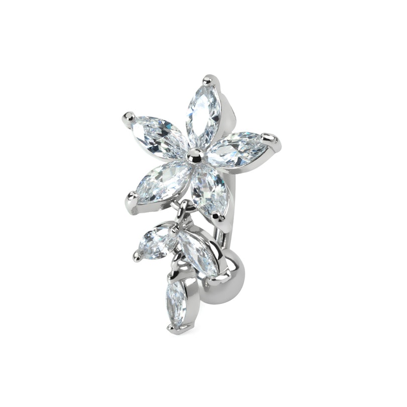 På detta smycke sitter hänget i toppen av smycket där det normalt sitter i botten. Det är mest logiskt att sätta den i botten pga tyngdkraften. Men i detta tillfälle kommer blomsterraden skjuta från toppen av naveln och täcka både navel och bottenkula så det bara är själva blomsterraden som man ser. Smycket är också perfekt till dig som är piercad i botten av naveln då blomman kommer sticka ut från naveln.