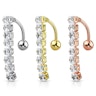 Smycket du ser på produktbilden består av en böjd stav av kirurgiskt stål. I botten sitter det där det normalt är en toppkula, men då denna är en omvänd navelpiercing, är toppkulan därmed placerad i botten och inte i toppen. Till gengäld sitter hänget som normalt placeras i botten nu i toppen. Det gör smycket perfekt om du är piercad i den nedersta delen av naveln. Du kan dock använda den i en "normal" navelpiercing, då kommer stenarna att sticka ut precis ovanför naveln och täcka både stav, kula och navel. Du kan välja denna modell i en av tre snygga färger som är en blank silverfärgad modell och två guldfärgade modeller. Oavsett vilken färg du väljer kommer smyckena vara lika med en stav på 10 mm och 8 fyrkantiga stenar som hänger efter varandra i hänget.