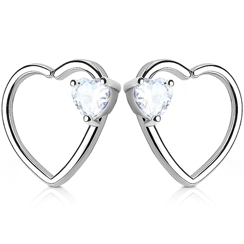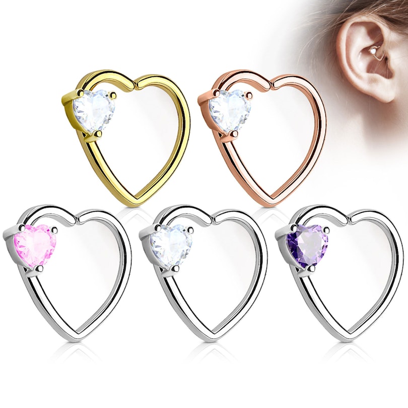 Om du köper detta smycke får du inget mindre än ett hjärta över ett annat hjärta. Strukturen på denna öronpiercing har formen av ett hjärta, på vilket en annan hjärtformad sten är svetsad. De invändiga måtten på detta hjärta är 11 mm bredd och 9 mm höjd. Denna lilla pärla är cirka 4 x 4 mm (5/32" x 5/32"), och som du kan se på bilden ovan är ringen utformad för höger öra, eftersom hjärtat bara syns på framsidan.