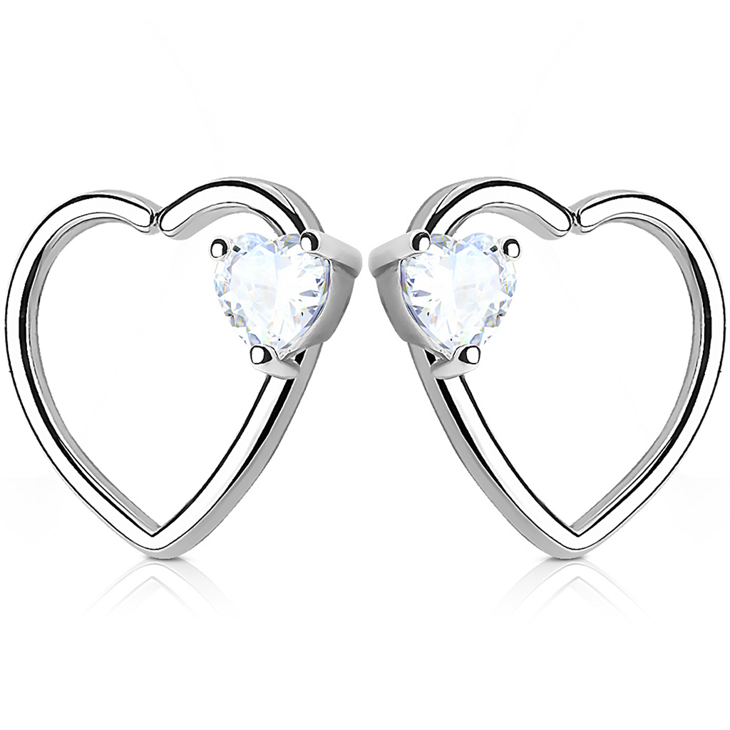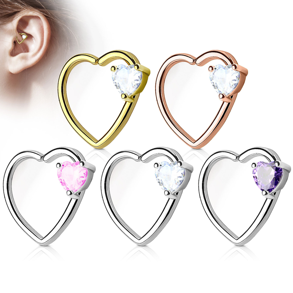 Om du köper detta smycke får du inget mindre än ett hjärta över ett annat hjärta. Strukturen på denna öronpiercing har formen av ett hjärta, på vilket en annan hjärtformad sten är svetsad. De invändiga måtten på detta hjärta är 11 mm bredd och 9 mm höjd. Denna lilla pärla är cirka 4 x 4 mm (5/32" x 5/32"), och som du kan se på bilden ovan är ringen utformad för höger öra, eftersom hjärtat bara syns på framsidan.