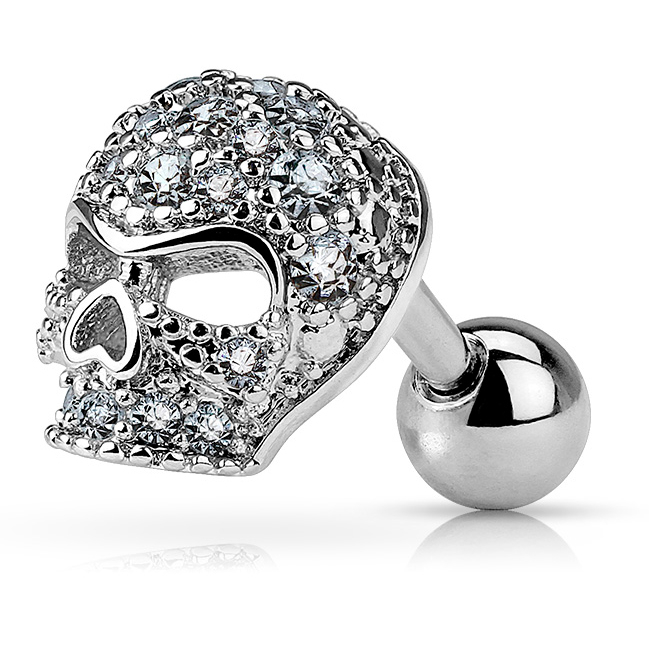 Edgy dödskalle som har placerats på en 6 mm stav med en 4 mm låskula på baksidan. Smycket kan användas på många olika ställen så se till att smyckets trådtjocklek och andra mått passar in med den piercing du har tänkt att pryda det med. Detta skulle t.ex. kunna vara tragus, helix eller helt enkelt öronsnibbarna. Oavsett vart du placerar smycket så kommer det att se häftigt och tufft ut med denna stenprydda dödskalle.
