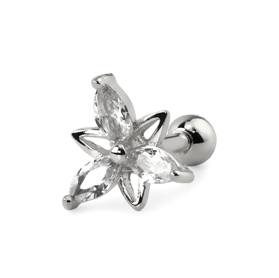 Vad det i första ögonblicket kan likna en fidgetspinner så är det faktiskt bara en trebladig blomma på en stav av kirurgiskt stål. Staven är avsedd för användning i en öronpiercing. Det kan vara i öronsnibben, i helix eller i tragus. Du kan såklart använda den på andra ställen på kroppen, viktigaste är att måttet på smycket stämmer överens med måtten på din piercing och att din anatomi passar till smycket. Det skulle exempelvis vara dumt att sätta den i en läppiercing pga låskulan bakom staven. Denna låskula är 3 mm bred. Staven är 6 mm lång och 1,2 mm tjock. Staven är gjort av kirurgiskt stål och blomman av mässing. Båda metallerna har efteråt blivit ytbelagda med antingen rodium eller 14 karat bladguld.