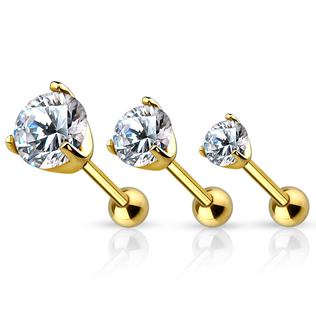 Här kan du få den läckraste lyxen i form av detta tripp, trapp, träsko öronpiercingset av äkta guld. De tre läckra öronpiercingarna har alla en trådtjocklek på 1,2 mm. och passar därför perfekt till piercingar som är gjord med nål. Varje öronpiercing är utrustade med en skinande vacker klar sten, men i tre olika storlekar. Du får alltså både en 2 mm, en 3 mm. och en 4 mm. stor sten i detta sätt.