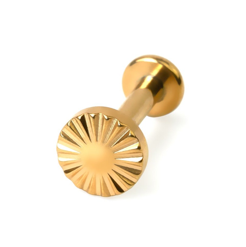 Den här stilsäkra labretten har en rund topp med utskurna linjer som strålar från mitten. Den har en invändig tråd och en platt baksida som gör den bekväm att bära och enkel att ta på. Den är tillverkad i implantatklassat titan vilket innebär att den är allergivänlig och skonsam mot känslig hud. Du kan välja bland guld- och silverbeläggning. Den är 1,2 mm tjock och finns tillgänglig i olika längder vilket gör att den passar de flesta piercingar.