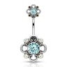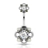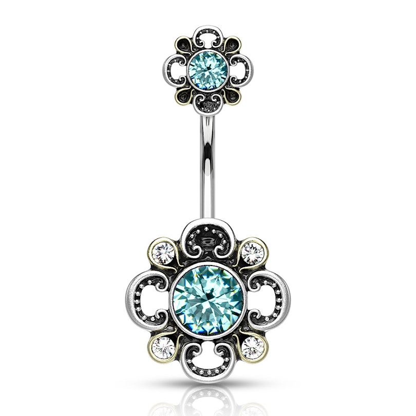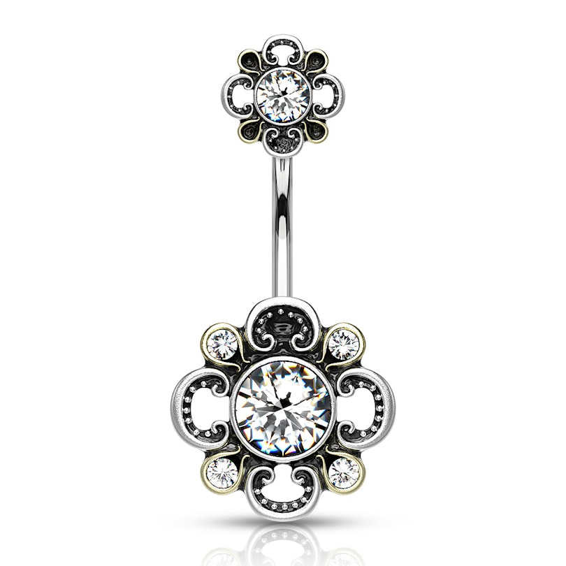 Namn: Navelring med filigranblomma med stansade blad och sten