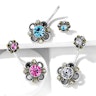 Den böjda barbellen är tillverkad av kirurgiskt stål, medan blommorna är tillverkade av mässing. Dessa är skiktade med en beläggning av antiksilver och snidade i en filigran design.