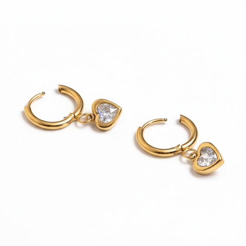 Par av ringar med hjärtberlock ger en lekfull touch till din vardagslook. Varje ring har en liten hjärtberlock som svänger när du rör dig. Med gångjärnsstängning är de lätta att sätta i och ta ur, perfekta när dagens planer blir kvällsplaner. Finns i färgerna guld och silver.