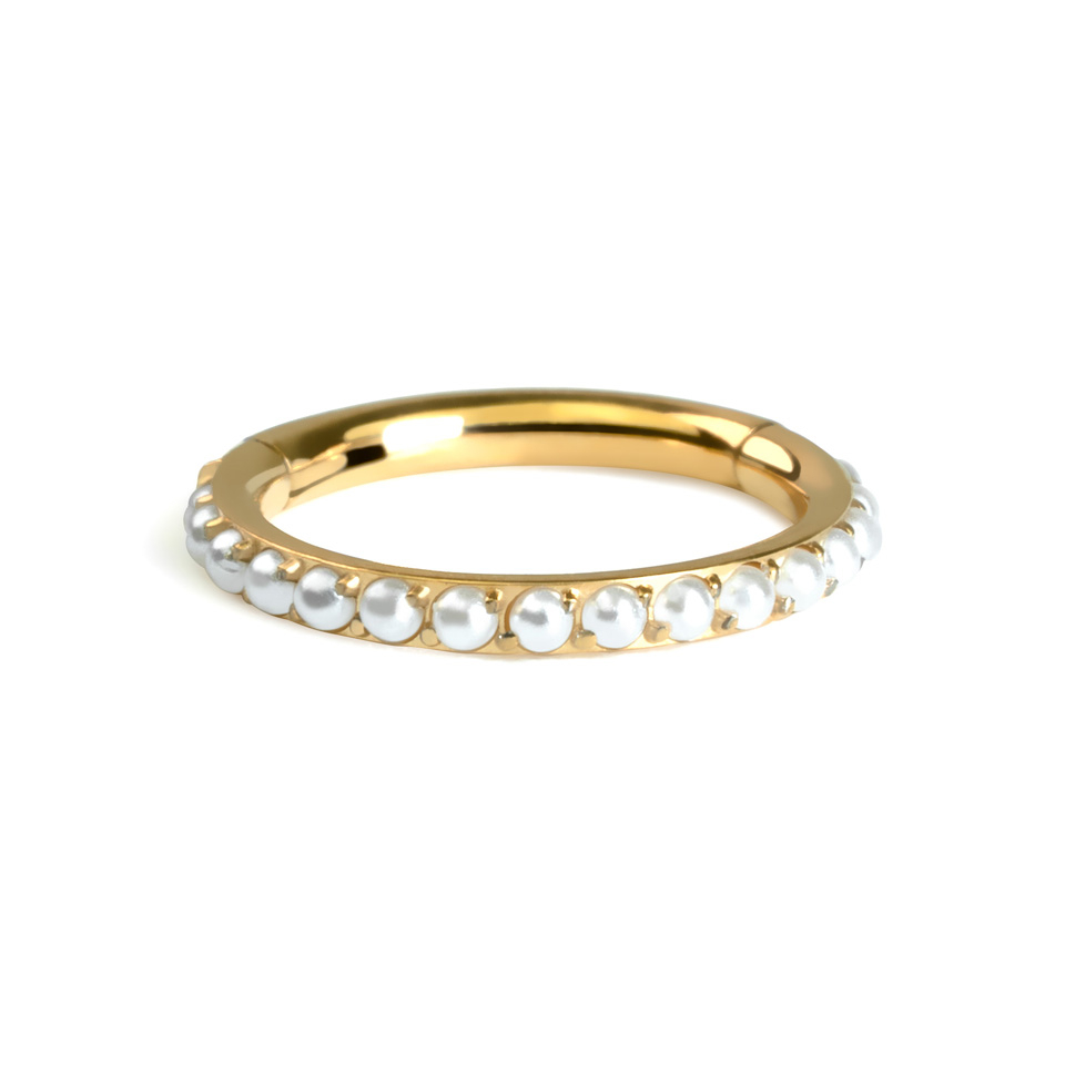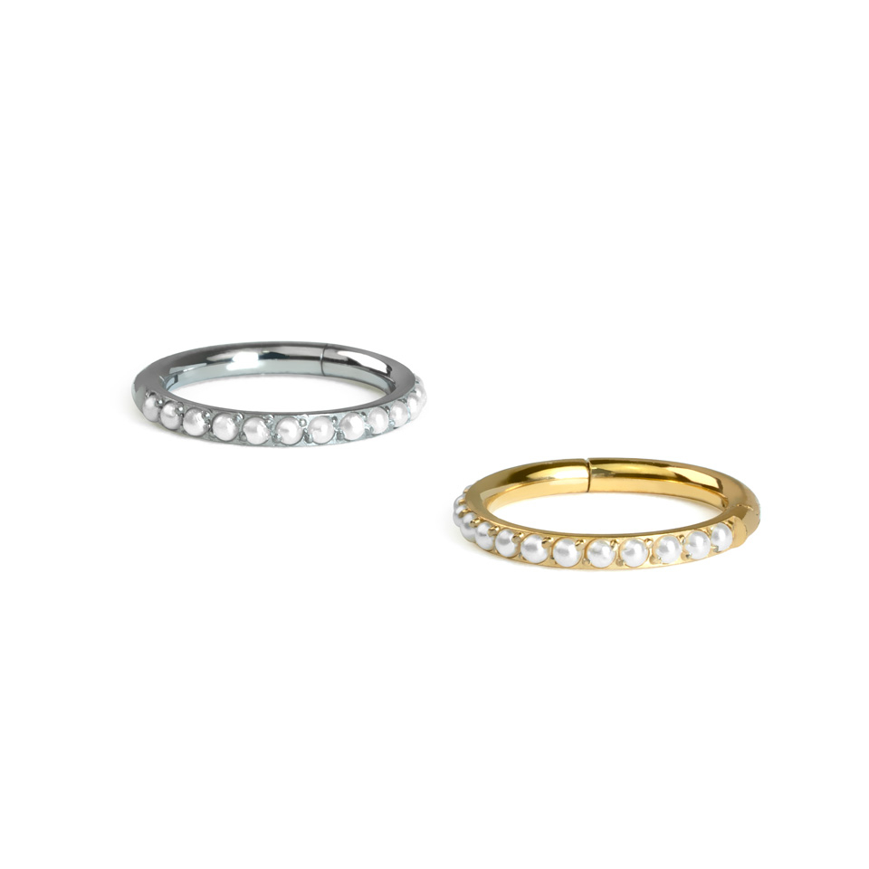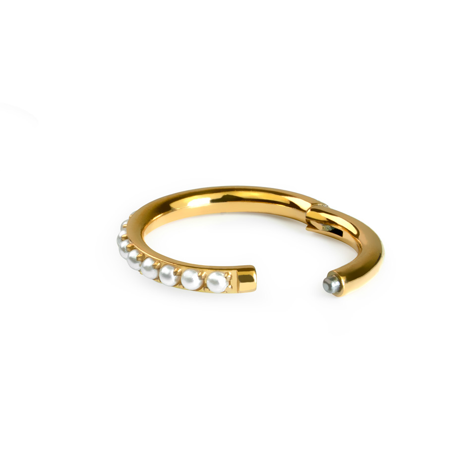 Lägg till en touch av elegans till dina piercingar med denna vackra ring, prydd med syntetiska pärlor för en elegant och tidlös look.