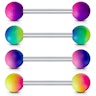 På bilden ovanför ser du en piercingsstav som är gjort av kirurgiskt stål med två kulor i varje ände. Kulorna på staven är belagda med gummi och de har både skiftande färgnyanser. Det är möjligt att välja mellan färgnyanser på kulorna, allt efter vad du föredrar – om det till exempel är blå/grön eller rosa/gul. De olika modellerna har samma trådstorlek på 1,6 mm samt en längd på 16 mm. Båda kulorna kan dock skruvas av, så du kan alltid köpa en längre eller kortare stav, om du önskar detta.