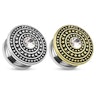 Själva skölden finns i antingen blank eller guldfärgat och är dekorerad med invändiga ringar, samt ett snyggt och rustikt kulmönster mellan varje ring. Det verkar nästan som om det är stenen i mitten som skapar ringar på vattnet ända ut till smyckets kanter.