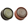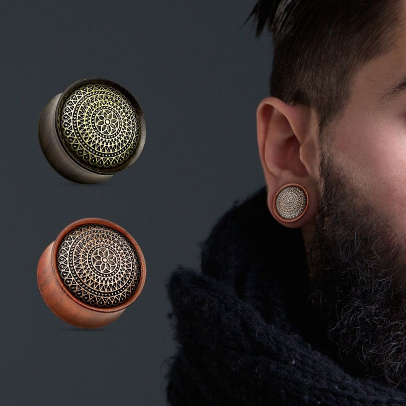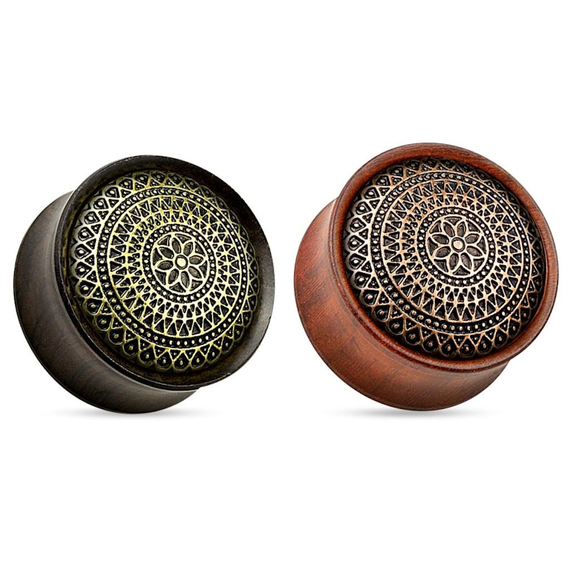 Organiska material som trä har den fördelen att det tillåter din hud att andas medan du bär smycket. Detta är det bästa för din hud och minimerar också obehaglig lukt. Den här pluggen finns på lager i två olika trävarianter. Välj mellan det rödbruna rosenträt eller den mörkare ebenholten. Framsidan på pluggen är gjord av mässing. På modellen av rosenträ är mässingframsidan rödaktig i färgen och på den andra modellen är det en traditionel mässingfärg. Färgen på mässingmönstret går därmed i trevlig kontrast till den naturliga träfärgen. Den gyllene framsidan på den svarta pluggen ger smycket en antik och dyr look medan den rödaktiga pluggen skapar en fin harmoni med det nästan kopparfärgade mönstret och ger en varm glöd.
