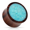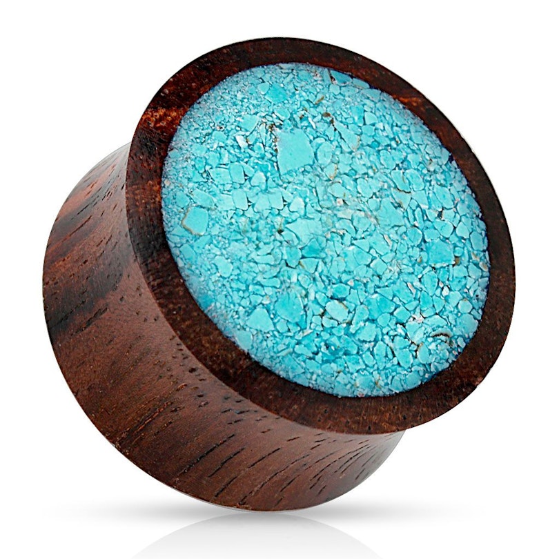 Här är pluggen dessutom dekorerad med en helt unik framsida som består av krossad turkossten. Alla små bitar av stenen passar ihop som brickor i ett pusselspel, varpå ytan har blivit polerad så att den är helt slät. Det är faktiskt ett litet konstverk i sig och ett helt nytt och kreativt sätt att bära stenar i sina smycken på.