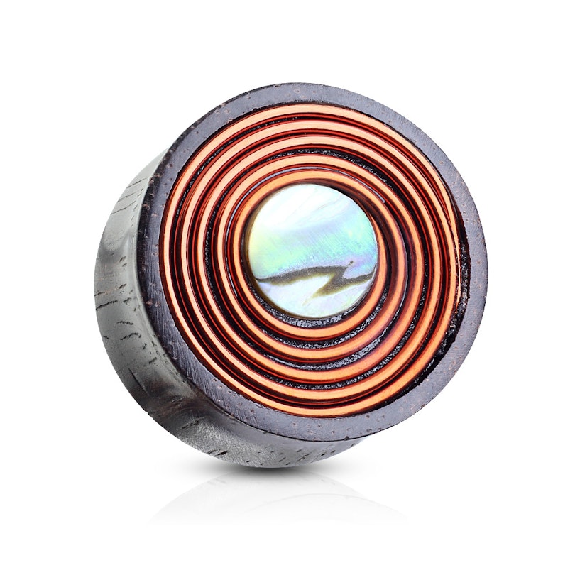 Pluggen som du har klickat dig in på är också gjort av ett organiskt material, nämligen trä. Smycket kommer i storlekar från 10 mm upp till 25 mm, så det är tyvärr inte ett smycke för nybörjare inom töjning – det är dock något att se fram emot medan man töjer. På framsidan av smycket sitter det en liten platta av pärlemor i mitten som omges av en koppartråd. Det låter lite underligt om man läser om smycket utan att ha sett det – men det klämmer fast pluggen mycket bra.