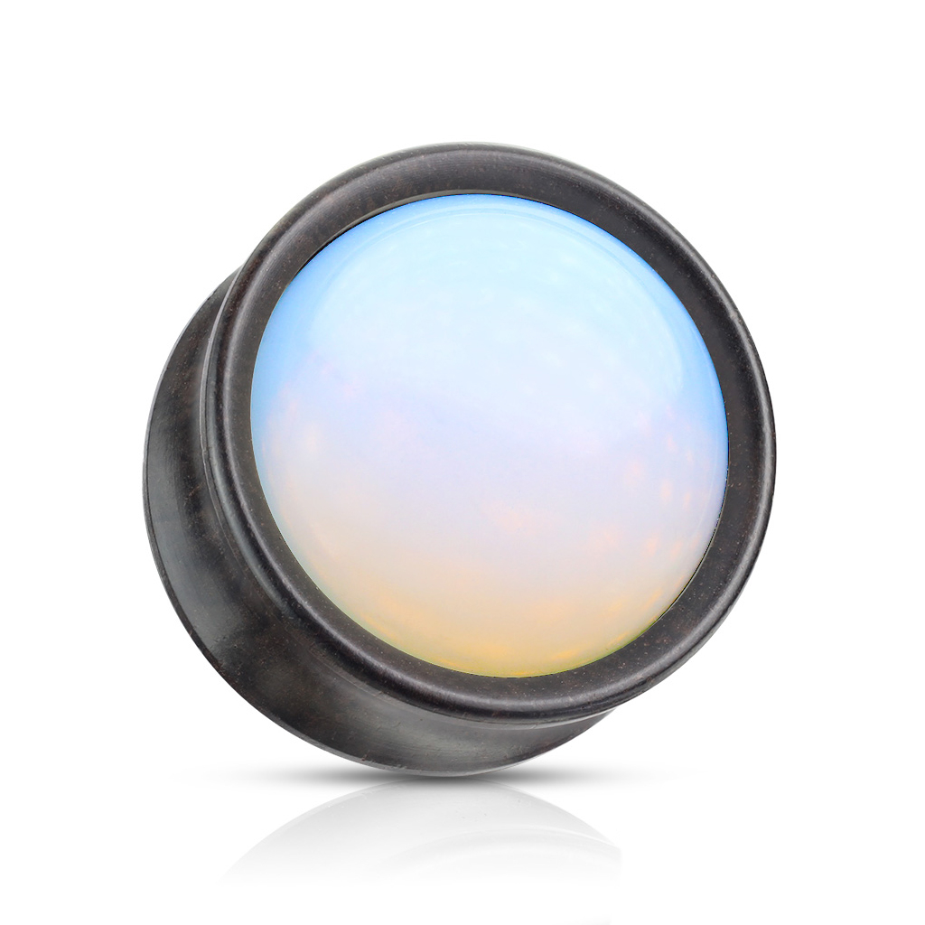 Denna plugg är gjord av två organiska material, trä och glas. Huruvida glas är ett organiskt material kan man diskutera då det är konstgjord av flytande sand. Oavsett så är pluggen här en fröjd för ögat med sin varma bruna trädfärg och den mjölkvita opaliten på framsidan. Opaliten är som du också kan se på bilden ovanför ändrar i färg. Den är primärt vit men har nyanser av både blå, rosa och orange i sig, allt efter hur ljuset träffar den.