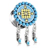 Om du känner till de äldre aztekerna känner du också igen deras kända pyramider, som du på denna plugg kommer se som små gula akrylpärlor sett från ovan. De fyra yttersta pärlorna är trappan upp till templet på toppen av pyramiden. Runt om pyramiden finns en blå emajle och ytterst i kanten är den dekorerad med blåa akrylpärlor hela vägen runt.