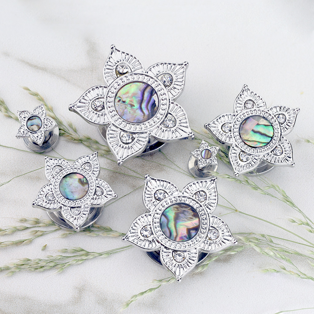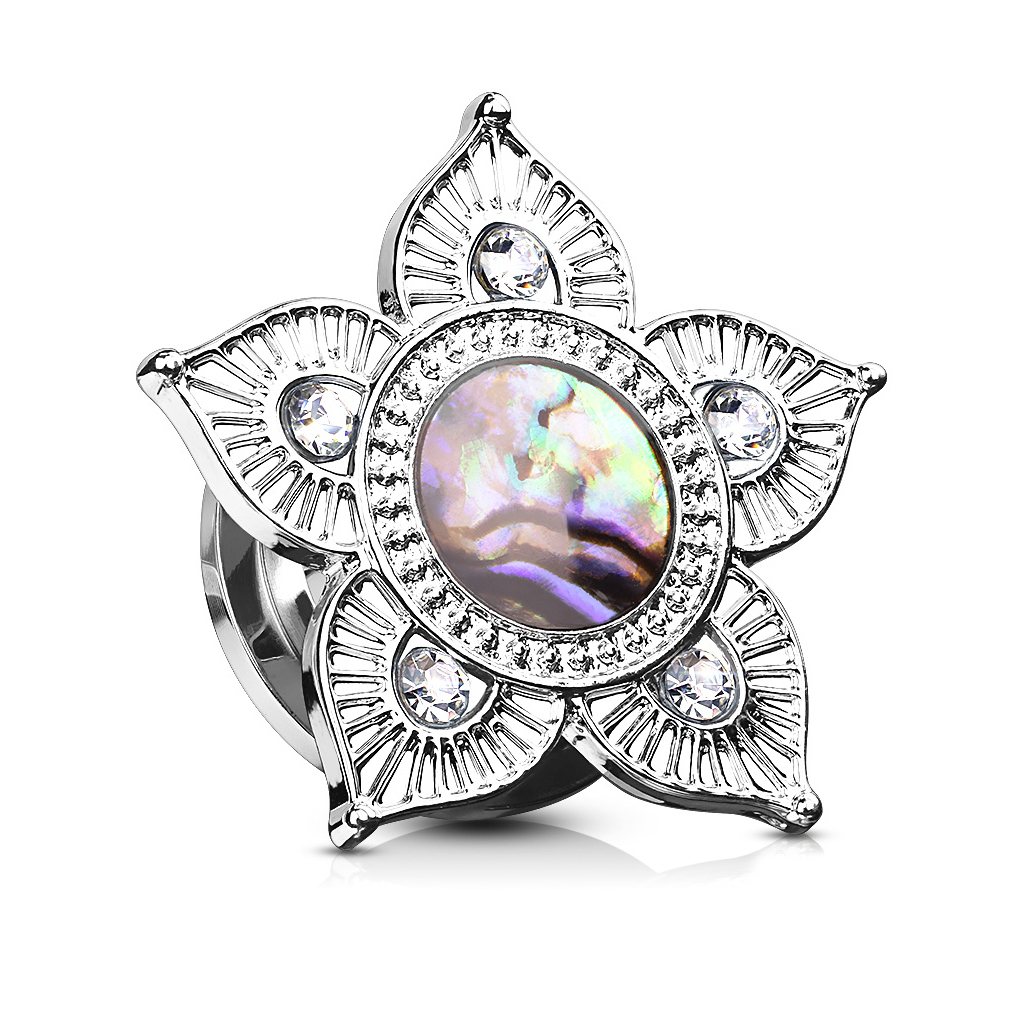 Du fick nog en glimt av den snygga pluggen på bilden ovanför. Denna plugg är dekorerat med en mässingfront som är formad som en lotusblomma. Var och en av blommans blad har fått några fördjupningar mellan, plus att det sitter en klar sten i botten av varje blad – detta gäller dock inte för storlekarna 3 mm, 4 mm, 5 mm och 6 mm. I mitten av blomman sitter det ett stort havsöra. Ett havsöra är en slags musselskal, som har en pärla skinande färg på insidan av skalet. Därför använts havsöra ofta tillsammans med bland annat smyckesframställning. Eftersom havsöra är ett naturmaterial, är det också värt at nämna att inget skal är det andra likt. Framsidan kommer därför vara olika på alla smycken.