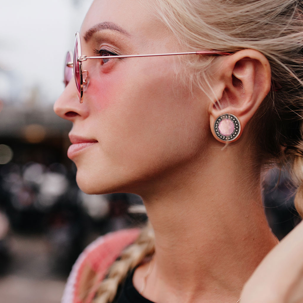 Pluggen som du har klickat på har blivit belagd med antikt silver på framsidan. Därav den mörka färgen som du kan se på bilden längre upp. Den mörka färgen gör verkligen att den rosa stenen träder fram. Runt omkring den rosa stenen sitter det flera små kulor som ger smycket ett djup - så att den inte blir så tråkig att titta på.