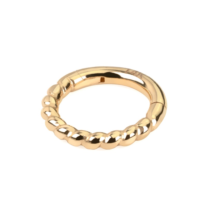 Ringen som du ser på bilden ovanför liknar en ring utan slut när den är stängd. Men på den lilla ringen finns faktiskt ett gångjärn, som kan öppnas och stängas genom att riva lätt i den lila delen av ringen. På det sättet kan du lätt montera ringen i din piercing och efter stänga den med ett litet klick. Ringen är gjort av 14 karat guld. Guld är känd för att vara ett smidigt material, vilket också är tillfället här.