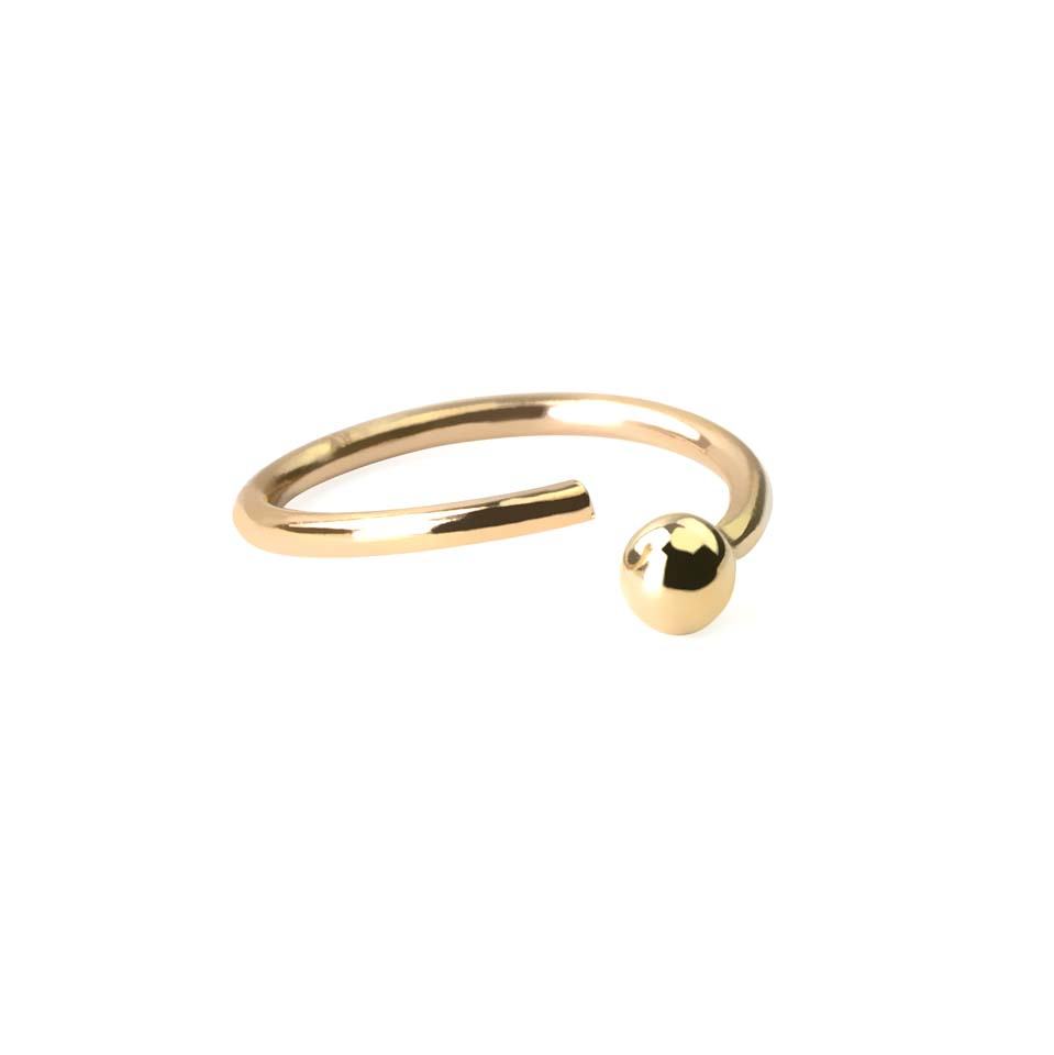 Snygg och praktisk ring av 14 karats guld. Den är snygg på så sätt att det inte är något annat än en rund ring i enda färg med en enda kula. Sedan är den också praktisk eftersom det inte finns någon låsmekanism som är svår att hantera eller faller ut ur stycket och tappas bort. Kulan är nämligen fast på den ena änden av ringen så att den blir en del av ringen. Det är ett smycke utan lösa delar.