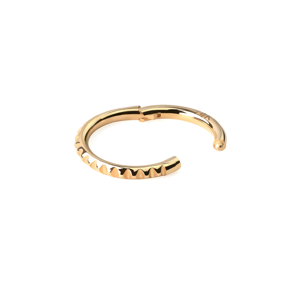 Den här ringen kommer i en trådtjocklek på 1,2 mm, vilket är standardstorleken för läpp- och öronpiercingar som görs med en nål. Ringen har ett gångjärn, vilket blivit alltmer populärt på grund av dess praktiska egenskaper. Gångjärnsringar öppnas enkelt genom att man drar upp det gångjärnsförsedda segmentet och stängs genom att man trycker ner segmentet tills det klickar på plats. Det snygga pyramidmönstret gör den här ringen till ett riktigt blickfång att lägga till i sin samling.