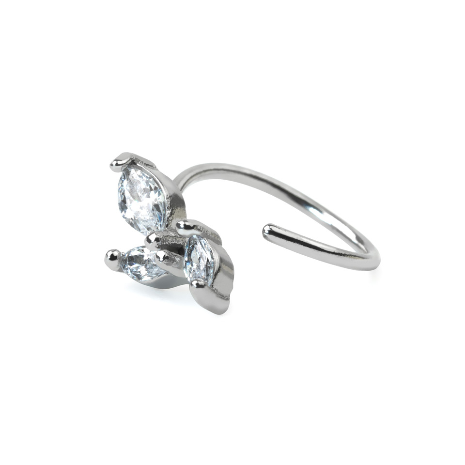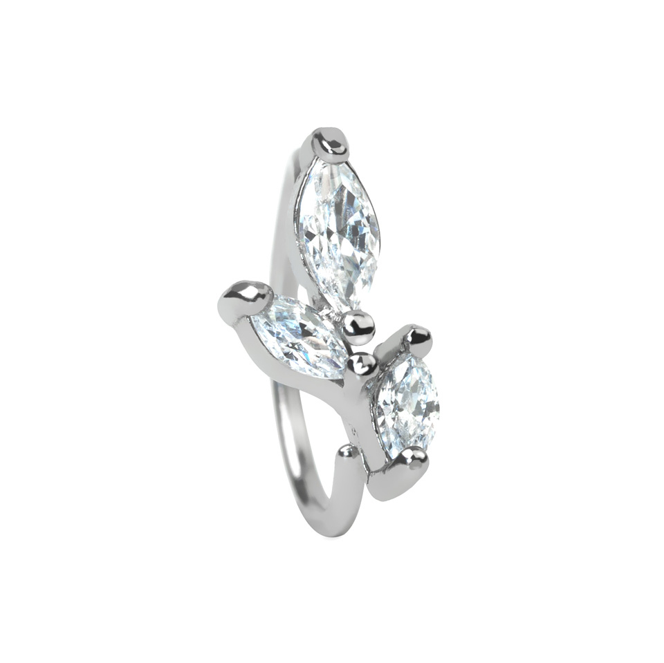 Den smyckade delen av ringen består av marquise-stenar i en design som liknar löv. Besättningen består av kirurgiskt stål som fäster till ringen.