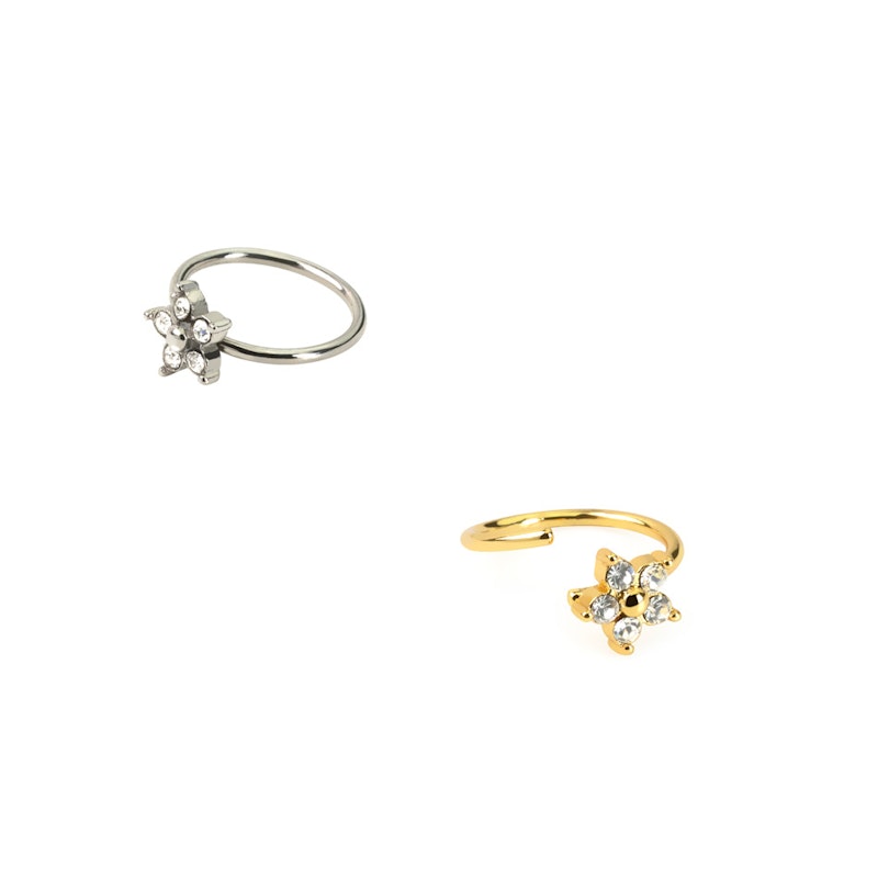 Den här fina ringen i kirurgiskt stål har en fin blomma med fem blad av ädelstenar runt en pärla. Den finns tillgänglig i färgerna guld eller silver och är tillverkad i kirurgiskt stål vilket gör den stark och hållbar. Den har en tunn tråd (0,8 mm/20g) vilket gör den perfekt för näspiercingar, men kan även användas för helix eller andra öronpiercingar. Det är bara att vrida den för att öppna, sätta in den i piercingen och vrida tillbaka för att stänga.