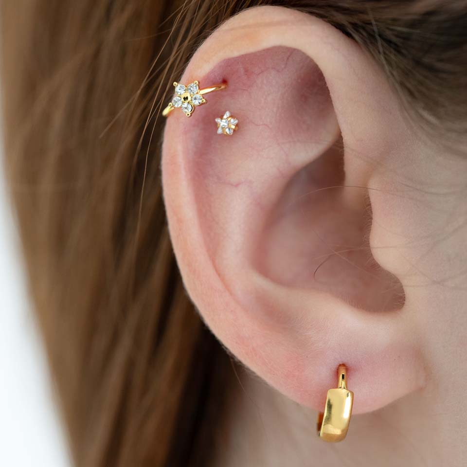 Den här fina ringen i kirurgiskt stål har en fin blomma med fem blad av ädelstenar runt en pärla. Den finns tillgänglig i färgerna guld eller silver och är tillverkad i kirurgiskt stål vilket gör den stark och hållbar. Den har en tunn tråd (0,8 mm/20g) vilket gör den perfekt för näspiercingar, men kan även användas för helix eller andra öronpiercingar. Det är bara att vrida den för att öppna, sätta in den i piercingen och vrida tillbaka för att stänga.