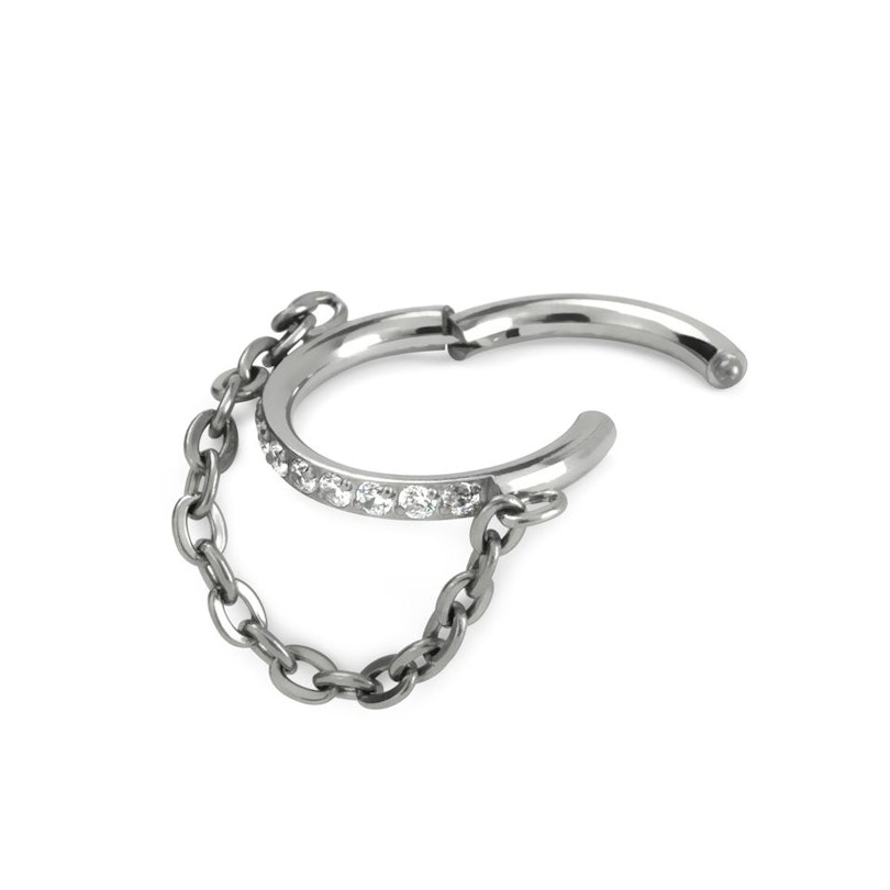 Ring i titan med gångjärn, en rad fina stenar och en kedja. Kedja hänger från vardera sida, ungefär halvvägs ned lite nedanför ringen.