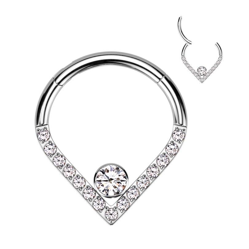 Det här iögonfallande smycket är perfekt för din samling, finare middagar, eller bara för att göra din outfit lite mer speciell. Med flera stenar som ramar in Chevron-formen och en stor CZ-sten inuti kommer du definitivt att stå ut i mängden.