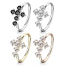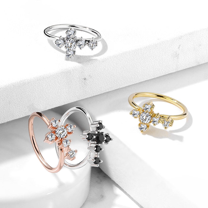 Smycket är gjort av mässing och mäter 0,8 mm i trådstorlek, samt 8 mm i diameter. Den har blivit belagt med platinum, om du väljer den blanka utgåvan, eller 14 karat guld, om du väljer en av de två guld modellerna. Som du nog redan har lagt märke till, så är det även ett kors på framsidan av smycket. Detta kors har blivit dekorerad med sex små stenar - dessa stenar kan du välja färg på. Du kan bland annat få ringen med klara stenar på korset, eller med svarta stenar på korset.