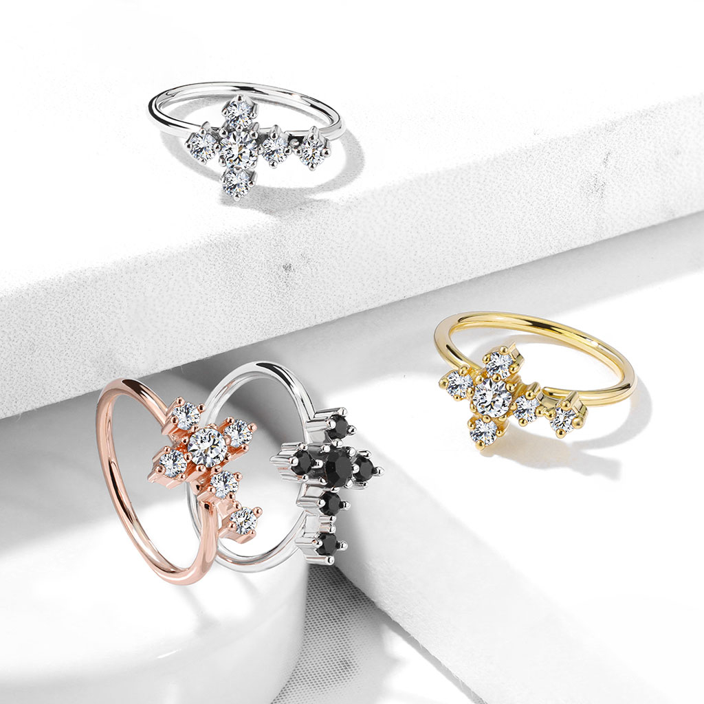 Smycket är gjort av mässing och mäter 0,8 mm i trådstorlek, samt 8 mm i diameter. Den har blivit belagt med platinum, om du väljer den blanka utgåvan, eller 14 karat guld, om du väljer en av de två guld modellerna. Som du nog redan har lagt märke till, så är det även ett kors på framsidan av smycket. Detta kors har blivit dekorerad med sex små stenar - dessa stenar kan du välja färg på. Du kan bland annat få ringen med klara stenar på korset, eller med svarta stenar på korset.