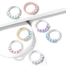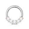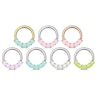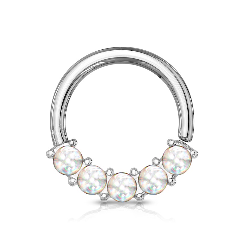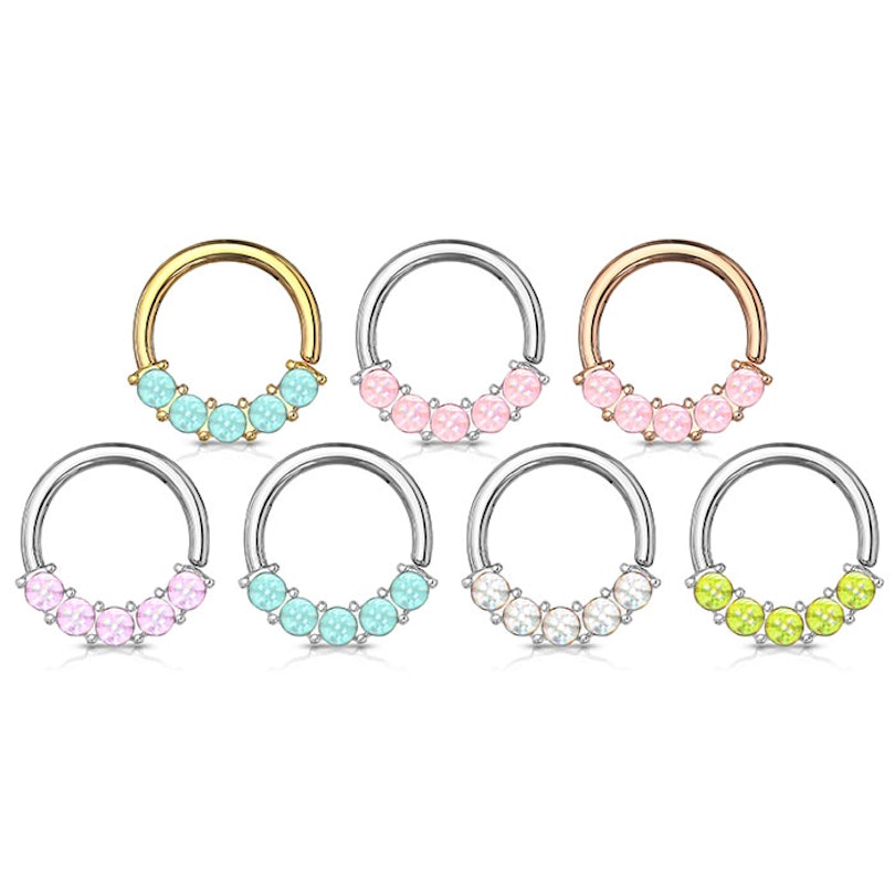 Smycket är gjord av kirurgiskt stål och belagd med olika färger. Du kan därför bland annat få ringen i en feminin rödguld, eller andra färger som tilltalar dig mer. Du kan se hela urvalet i rutorna lite längre upp på sidan. Ringen är gjord till att kunna vridas fram och tillbaka - därför är den också otroligt lätt att använda. Det är dock inte endast färgen på ringen du kan välja. Du kan också välja mellan många olika stenfärger på de fem reflekterande stenarna som sitter på framsidan av smycket. Färgerna hittar du också i rutorna längre upp på sidan. Stenarna är gjorda av en harts som får stenarna att reflektera ljuset som når dem. Så här får du ett mycket skinande smycke som helt säkert kommer vara iögonfallande oavsett vart den sitter.