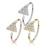 På framsidan sitter det en fin liten trekant som fungerar som dekoration på ringen. Trekanten har blivit dekorerad med flera pyttesmå klara stenar, som sitter och glimtar. Trekanten har också blivit belagt med olika beläggningar så att den matchar ringen som den sitter på.