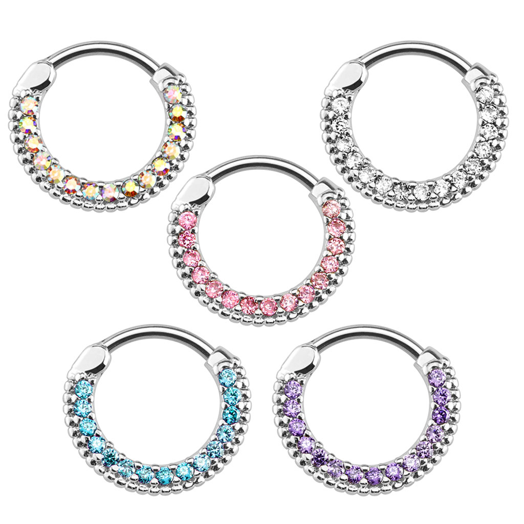 Septumsmycket är dekorerat med en hel pärlkedja av vackra stenar hela vägen längst kanten och modellen här finns i hela fem olika stenfärger. Stenarna går ända upp till själva staven så när smycket sitter där det skal så kommer man inte kunna se annat än de vackra stenarna som glimtar i ljuset när man rör sig. Oavsett vilken variant du väljer är alla stenarna vackert inramade av en kulformad stålkant på yttersidan. Designen är både elegant och välgjord ända in i minsta detalj.
