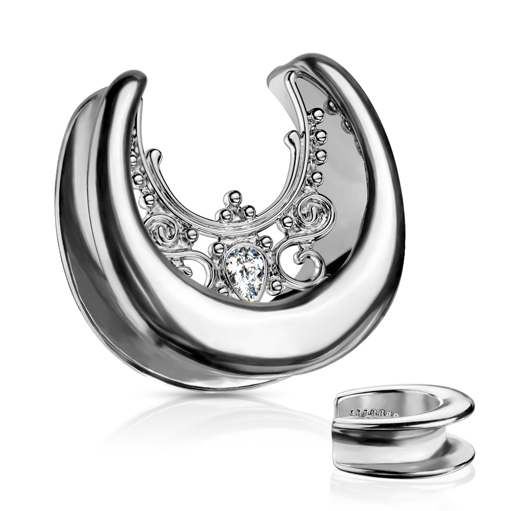 Denna saddle spreader kan likna våra andra saddle spreaders men den har vackra vändningar inne i själva smycket. De kallas filigran, och består av små vändningar med små kulor. Det finns inget bestämt motiv att se i designen, men som helhet kommer det att se ut som ett tätt broderat mönster. Mitt i mönstret sitter en liten klar droppformad sten som kronan ovanför verket.